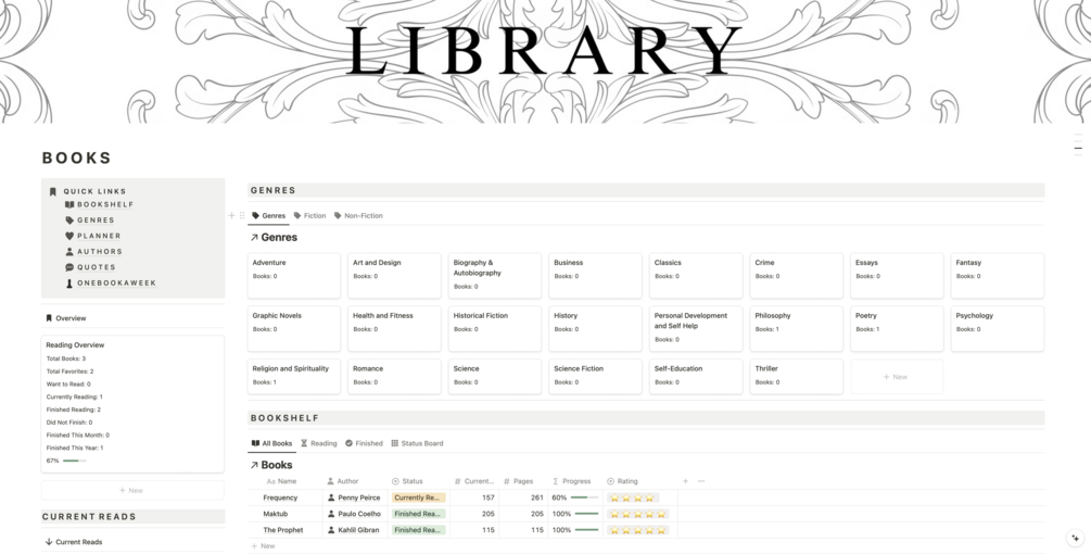 - Reads Overview: Summarize your completed books, including key takeaways and favorite quotes, for easy reference.